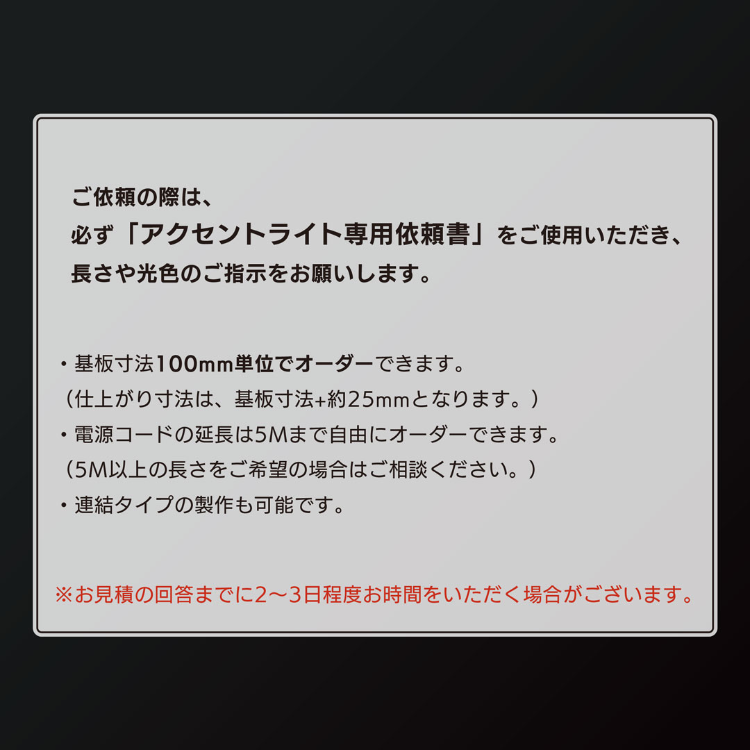 ご依頼の際は、必ず「アクセントライト専用依頼書」をご使用いただき、長さや光色のご指示をお願いします。